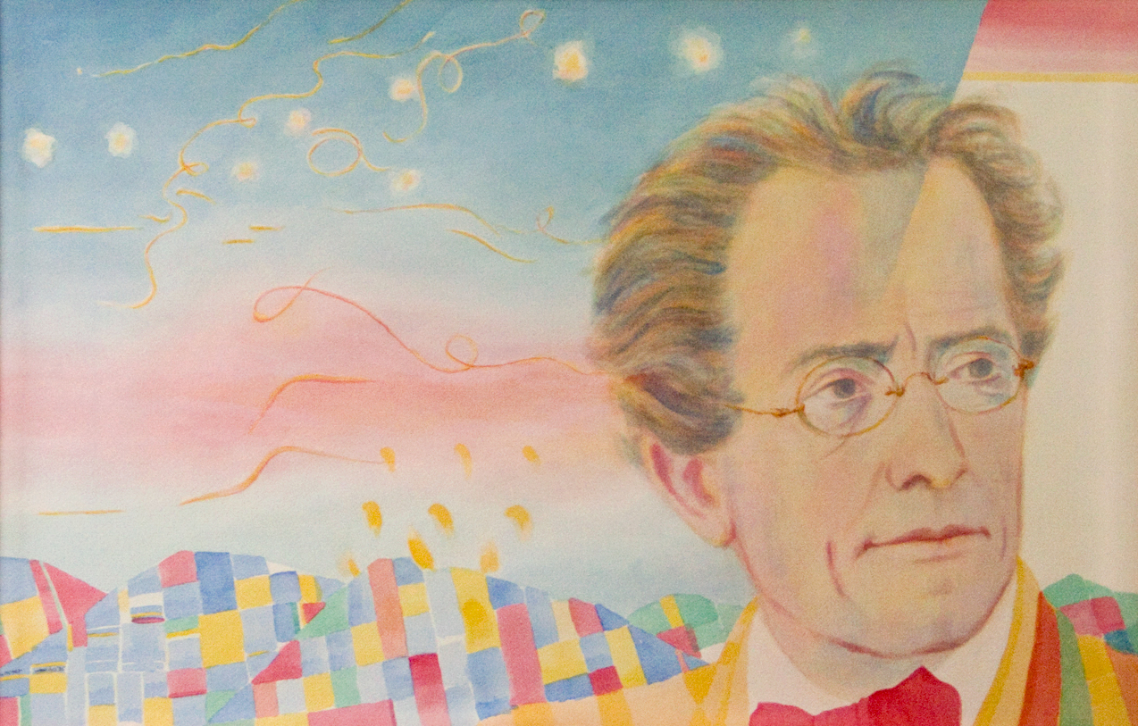 Mahler IV , bijgenaamd 'De Italiaanse' omdat de in zijn pak gebruikte kleuren mij Italiaans aandeden ; het okergeel gecombineerd met vermiljoenrood en groen ,naast het wit van de boord , onwillekeurig moet je aan de Italiaanse vlag denken . Ik maakte dit schilderij voordat ik wist dat Mahler af en toe uitstapjes naar Milaan ( Mailand ) maakte . Alma Mahler vertelt in een van haar memoires , dat ze een keer uit tijdgebrek het vliegtuig van Milaan naar Wenen namen en boven de Alpen in een storm terecht kwamen .In het schilderij zie je een geometrisch berglandschap en in de lucht lijnen die je zou kunnen interpreteren als de zwalkende vlucht van het vliegtuig . Mahlers kop is gebaseerd op foto's van de serie die Alfred Roller maakte in 1907 in de Wiener Hoffoper tijdens Mahlers laatste jaar daar als dirigent en intendant .Mahler maakt niet zonder reden , een diepbezwaarde indruk . Zie ook : Gilbert Kaplan , foto's 79-91 .