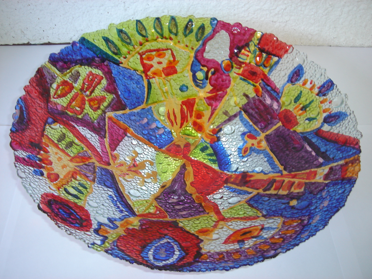 Schaal glas beschilderd met glasverf. Diverse kleuren en goudverf, doorsnee 38 cm. Kleurrijk.