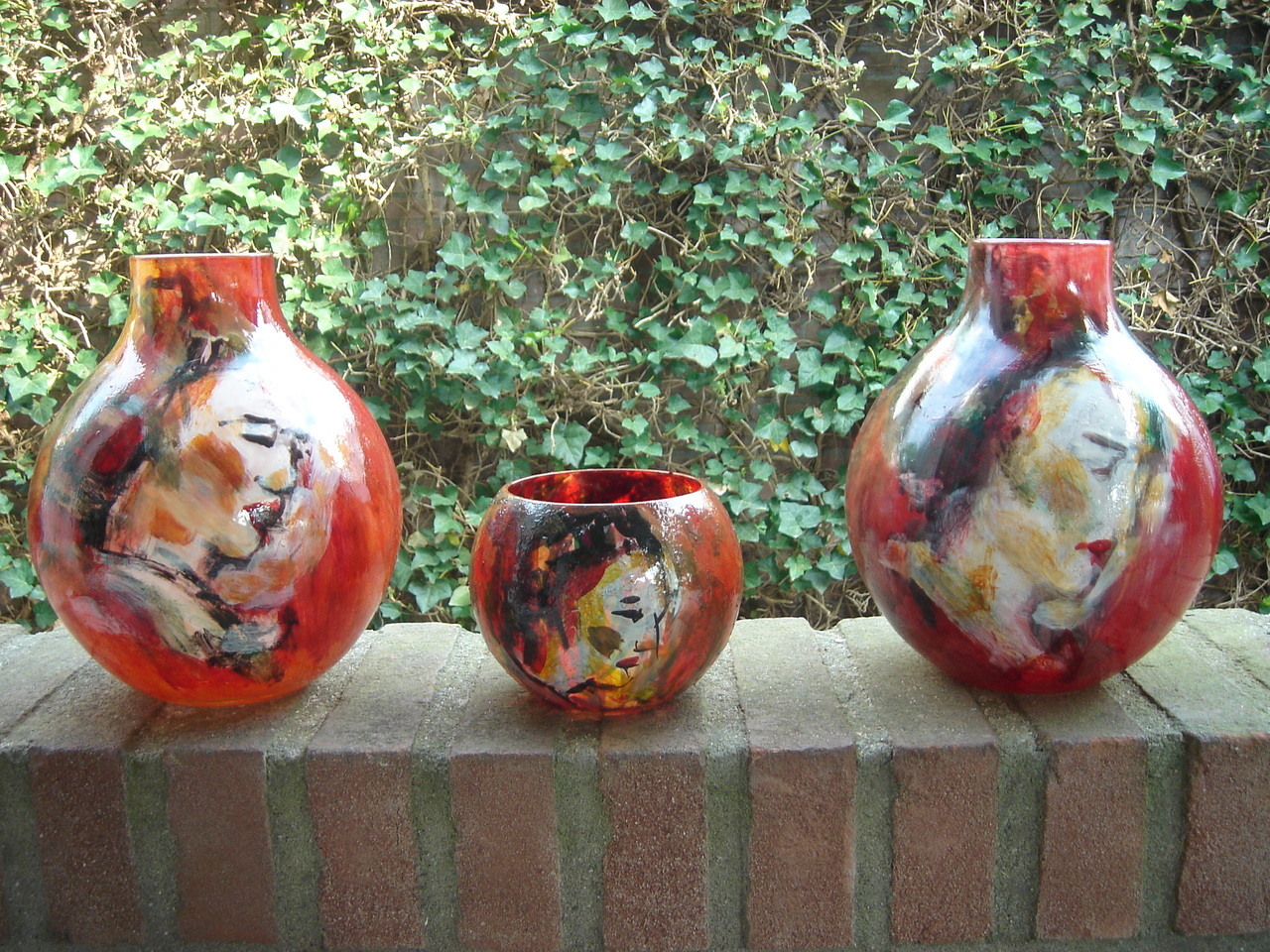 Beschilderd glas, vazen met glasverf. Diverse soorten, kleuren en afmetingen.