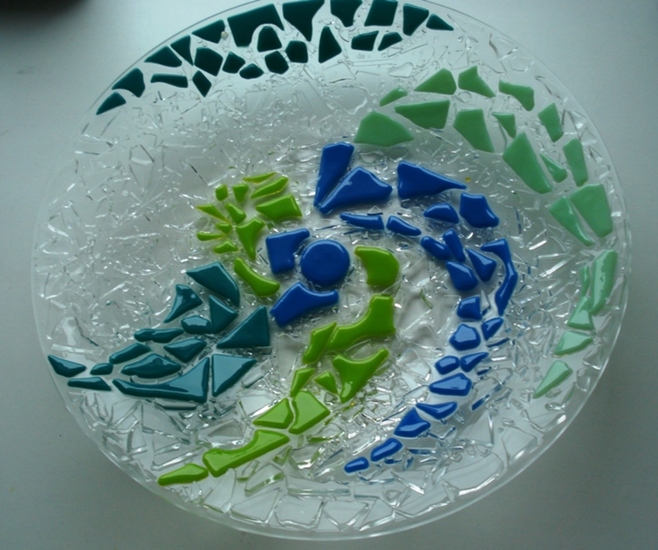 Ronde schaal, glasfusion, mozaïek, uitwaaierend blad