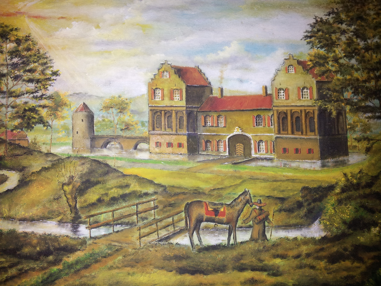 Een man met een paard kijken over een beekje uit naar een kasteel.