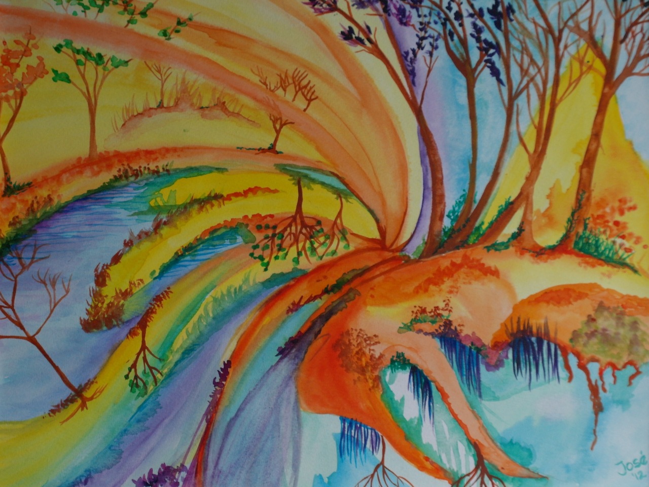 Surreel Oranje Geel Blauw Kleurig Beweging Aquarel Bomen