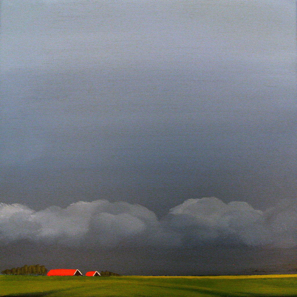 Zonlicht aan de horizon, een boerderij en laag wolkendek.