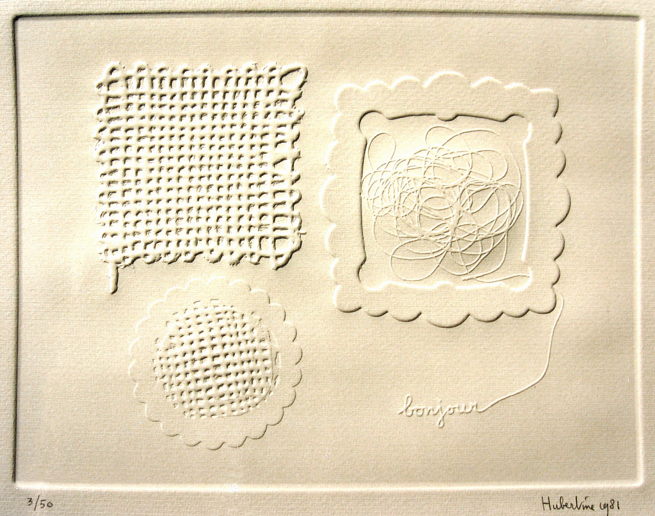 'Bonjour' is een diepdruk-ets zonder ets-inkt. Het lapje werd geweven op een miniatuur weefgetouw.