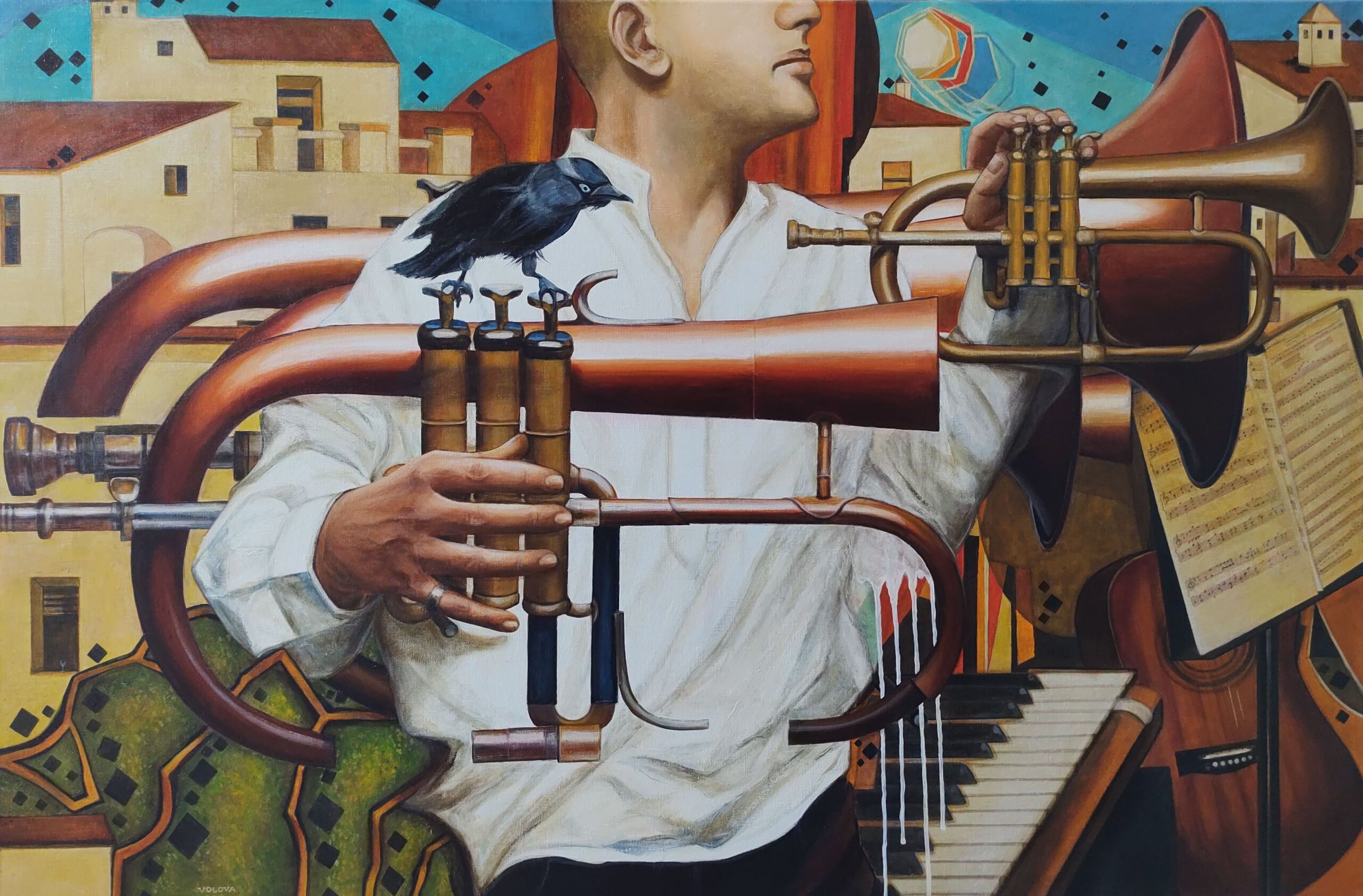 Surreeel Acryl Bruin Muziek Jazz Stad Town Men