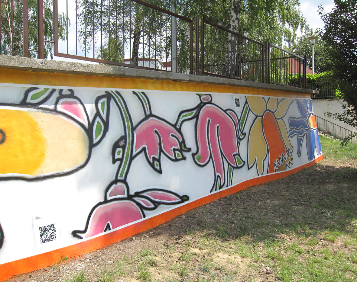 Bikkel initiate project 'HOPE & LOVE' at Vukovar, Croatia. May 2012 Bikkel starting brush painting Netherlands flowers at the Antun Bauer Schoolwall. Bikkel is helped by schoolchildren, artists of Vukovar, WAG and other projects. All together bringing hope and love at Vukovar. Bikkel brush paint the portrait of Antun Bauer and also four QR codes.