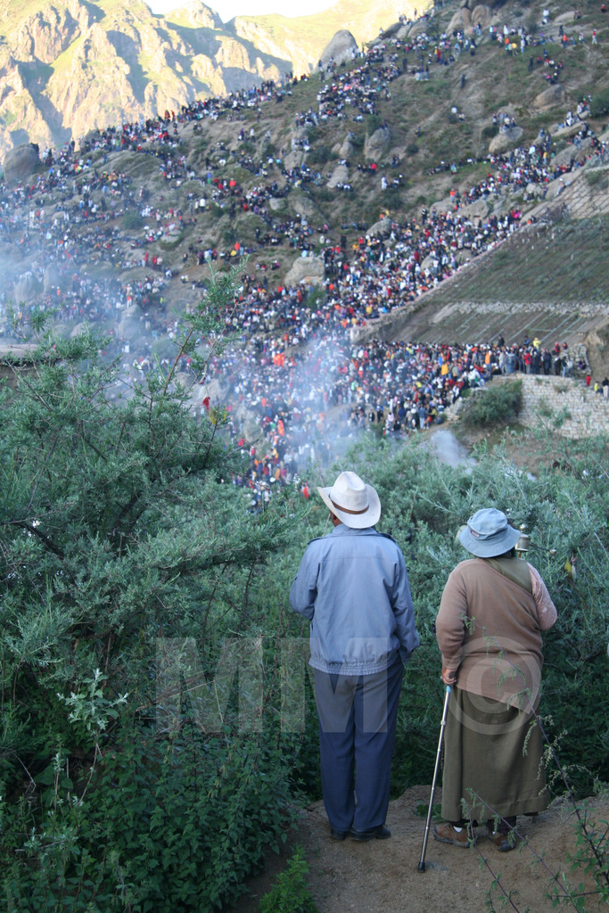 Een ouder Tibetaans echtpaar kijkt vanaf een afstand toe op een traditioneel religieus ritueel.