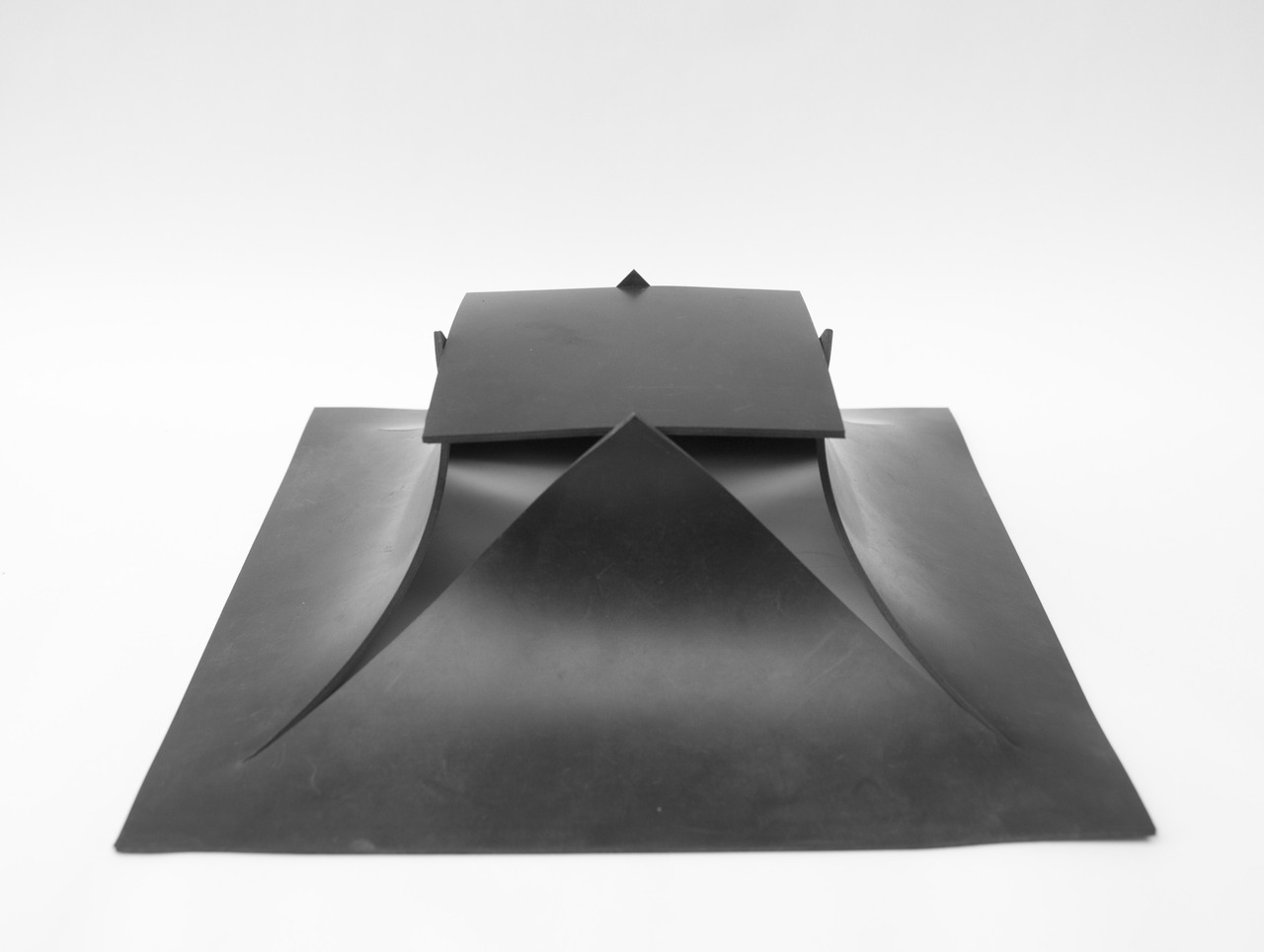 Vierkanten van rubber. Eén vierkant is op de diagonalen gesneden en door het open te klappen vangt het een kleiner vierkant.