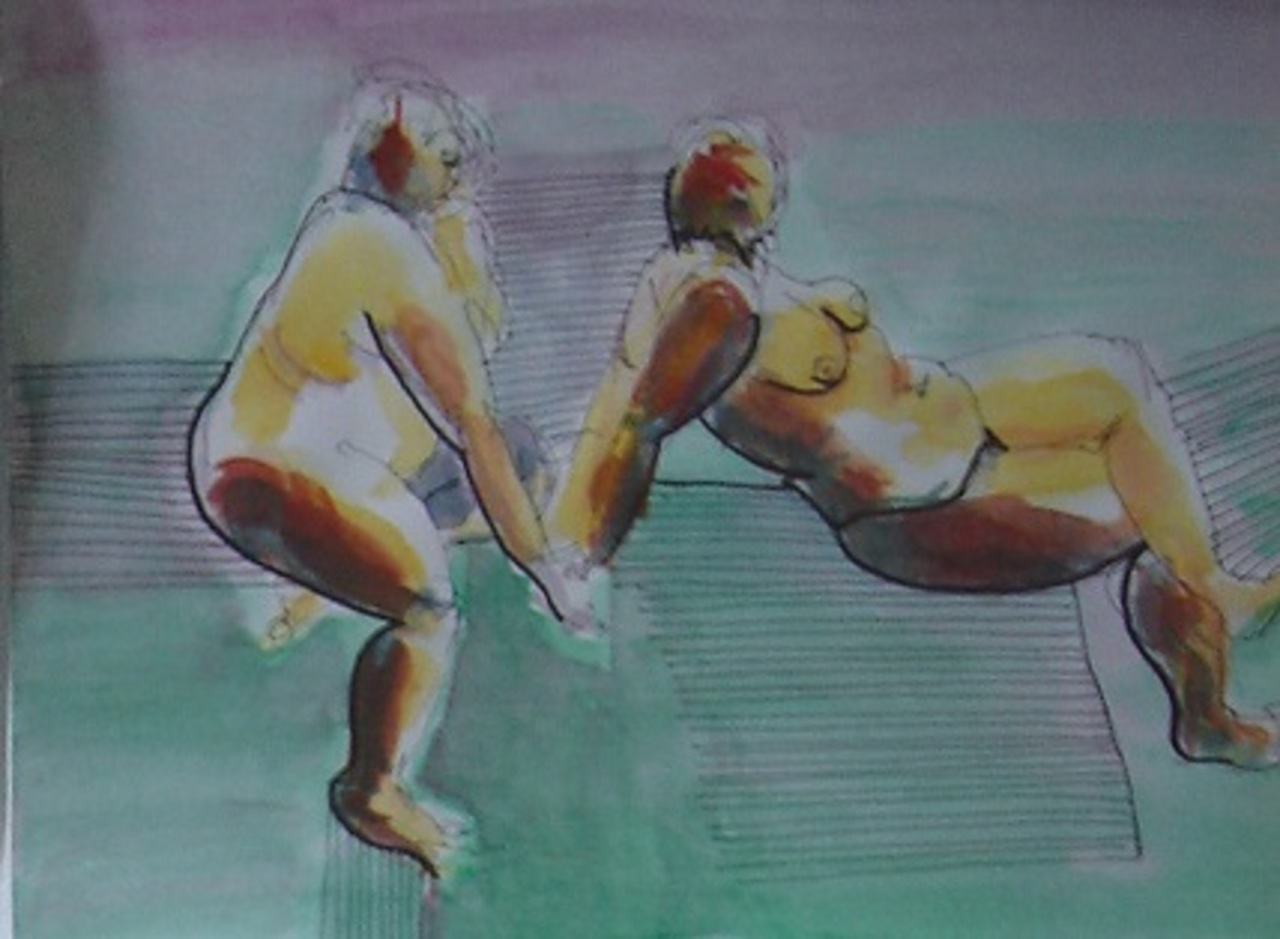 Twee naakte vrouwen. Schets in inkt en aquarelverf op papier ca. 20x25 cm.