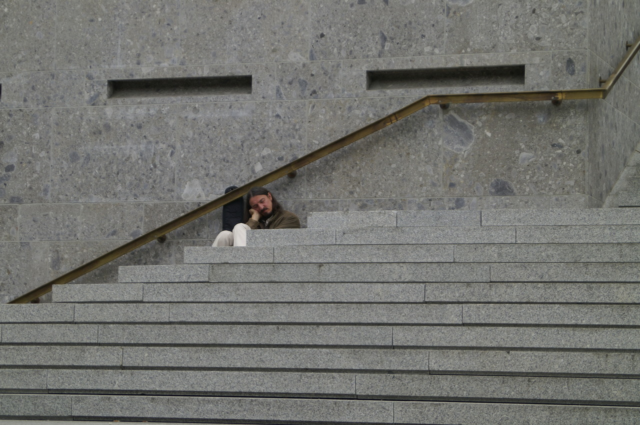 Een zwerver zat helemaal alleen op een grote trap in Keulen weggedoken van de mensenmassa