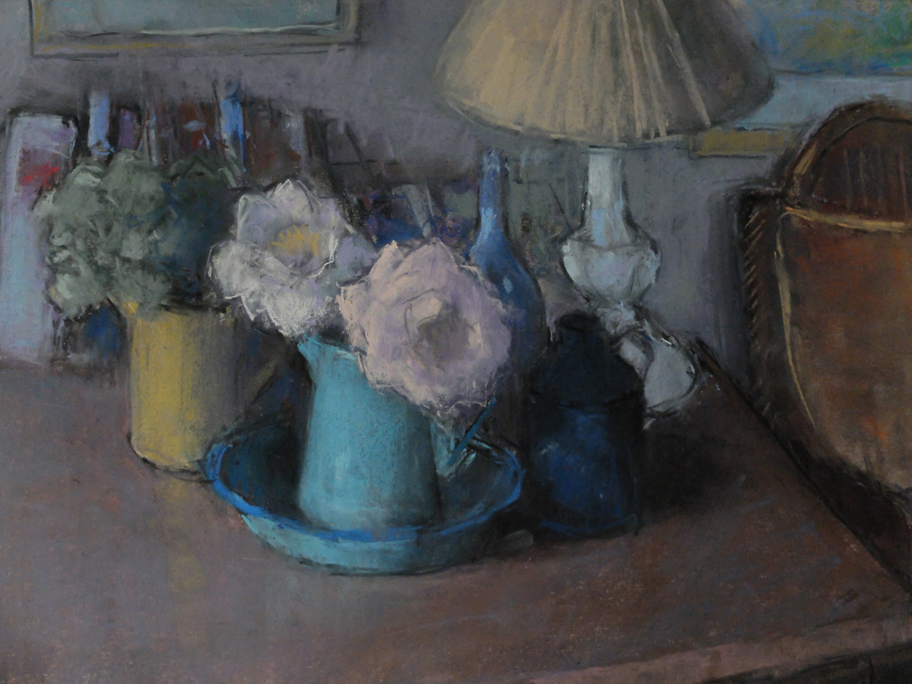 Stileven met kunstbloemen in blauwe kan.