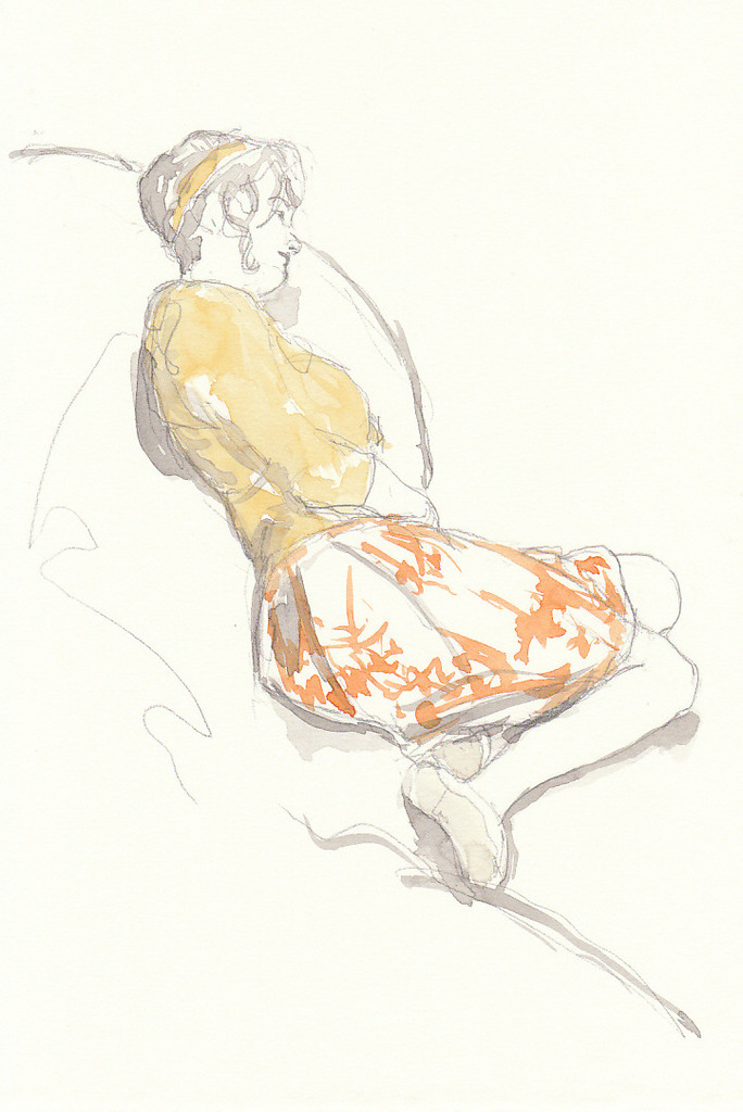 Dit is een langere pose door het schildersmodel. Dan ontstaat de verleiding om te lang aan een tekening te werken waardoor teveel de nadruk zou liggen op de techniek.