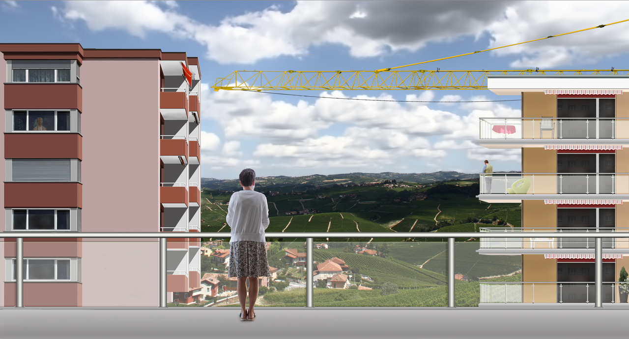 Een vrouw staat op het balkon van haar luxe appartement kijkend naar de bergen omringd door gebouwen die later zijn neergezet terwijl een bouwkraan aan het werk is.