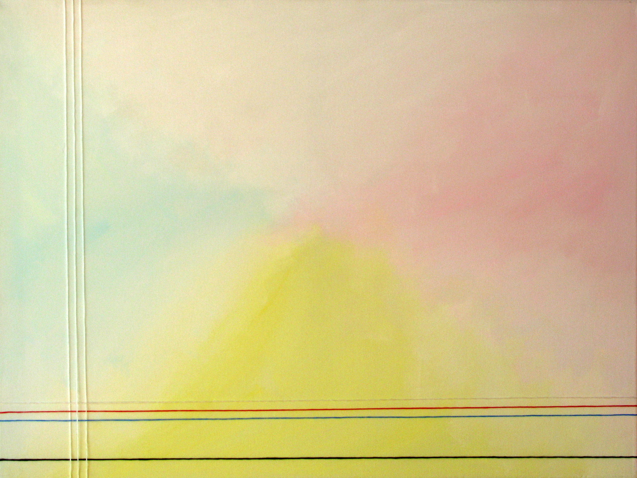 Men neme: Een schildersdoek, een beetje rood, blauw geel en een paar draden. Resultaat? Een (minimalistisch) landschap.