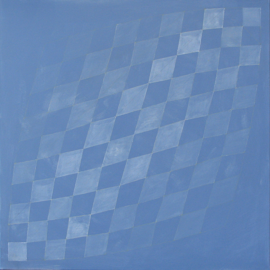Spelend met vierkanten die geleidelijk vervormen in ruiten. Wit op een blauwe ondergrond. Het geeft de suggestie van een ronde vorm of zelfs van een ouderwetse theedoek.