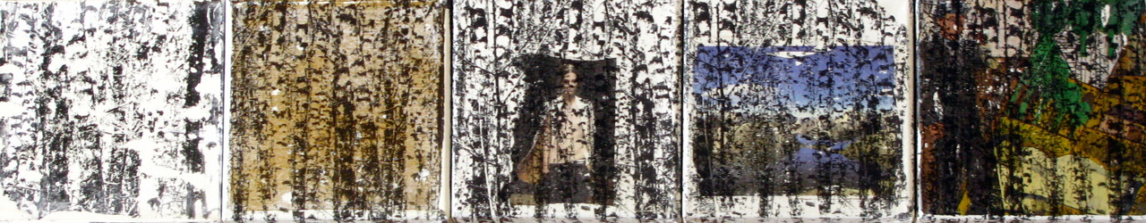 Vijf kleine doekjes van 20x20 cm. Steeds hetzelfde berkenbos (althans de stammetjes), maar dan steeds met een andere achtergrond: wit, goud, mode, kustlandschap en een afbeelding van een schilderij van Brusselmans.