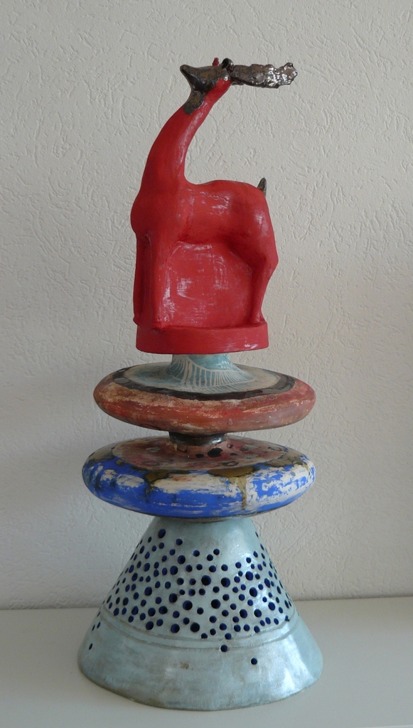Het object is handgevormd; het bestaat uit drie delen. In de onderste laag zitten gaten waardoor de cobaltblauwe bewerking van de binnenkant zichtbaar wordt. De middelste laag is bewekt met glazuur en engobes. Het hert is gekleurd met keramisch pigment en goudglazuur.