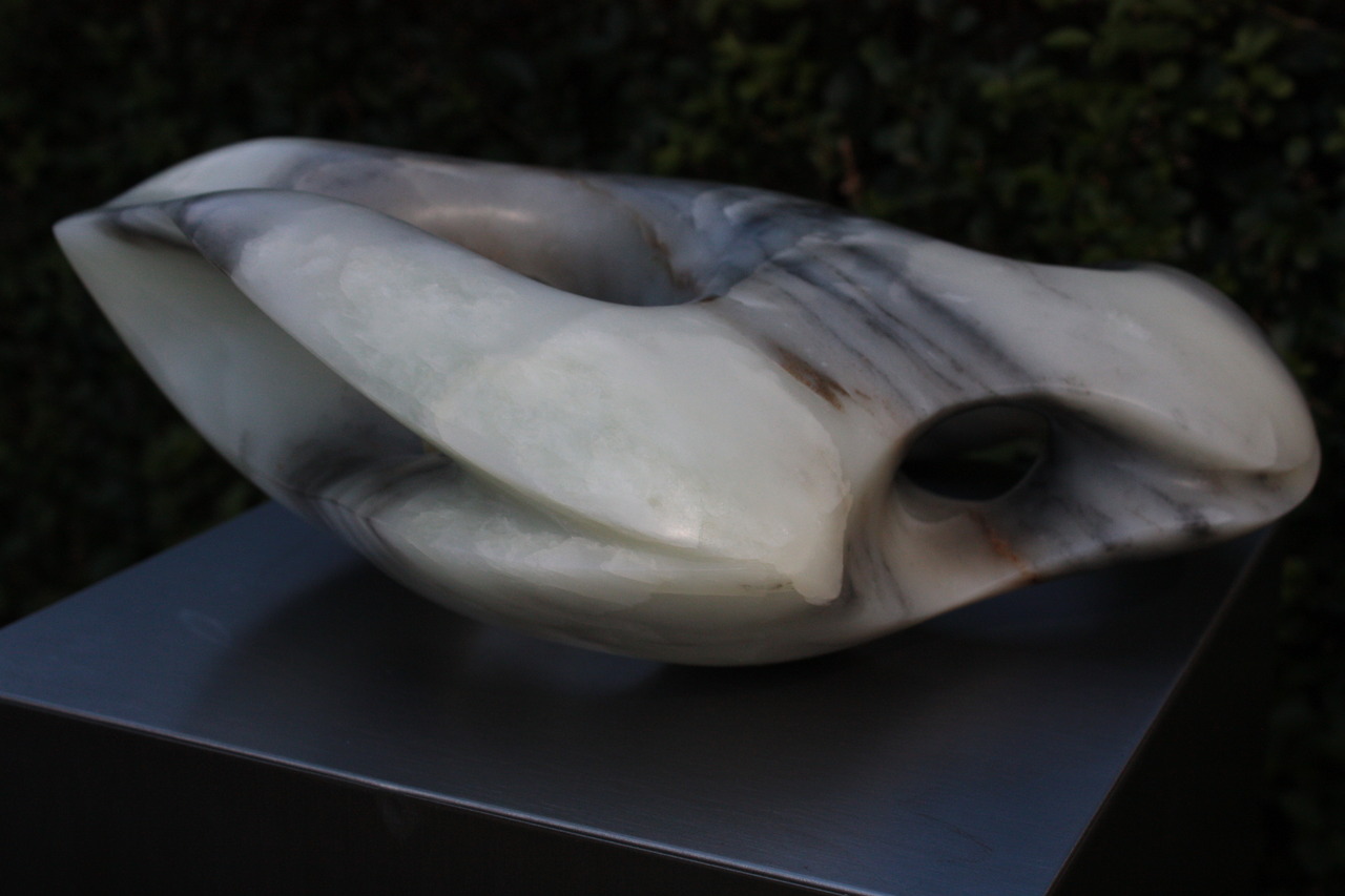 Sculptuur in Chinees speksteen. Veel wit met een beetje zwart/grijs. Sculptuur kan op diverse wijze neer gelegd worden. Zeer transparant op diverse delen. Zonder sokkel. Er kan een rvs sokkel besteld worden van 100 x 25 x 25 cm. Prijs sokkel incl 175,00 Prijs inclusief btw en commissie bij aankoop in galerie. Aankoop buiten exposities ook mogelijk bij de kunstenaar.