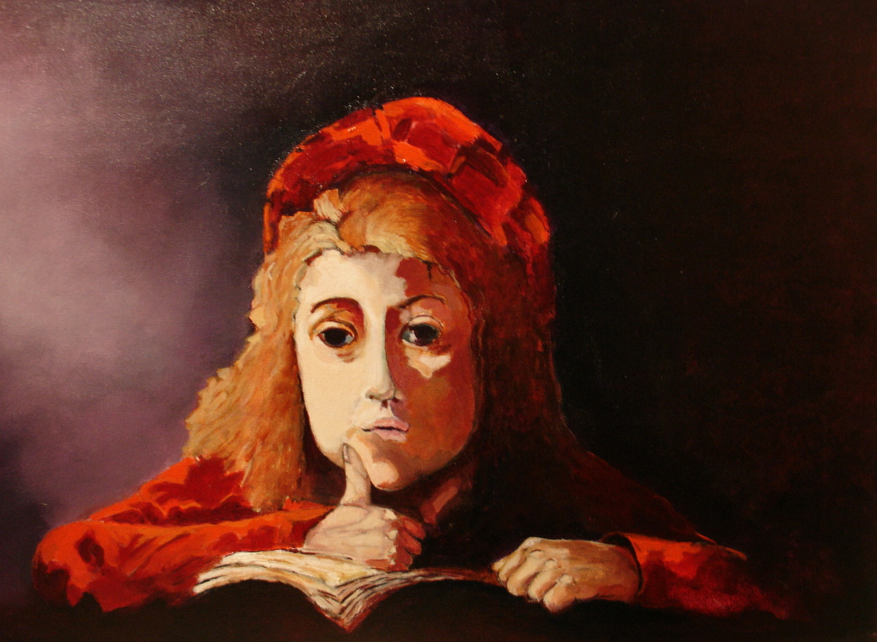Ik bezocht de tentoonstelling Carravaggio- Rembrandt en werd onmiddellijk getroffen door het jeugdprtret van Rembrandts zoon Titus. Zo warm en menselijk heb ik zelden, tot op vandaag, een portret gezien en besloot er mijn eigen draai aan te geven.