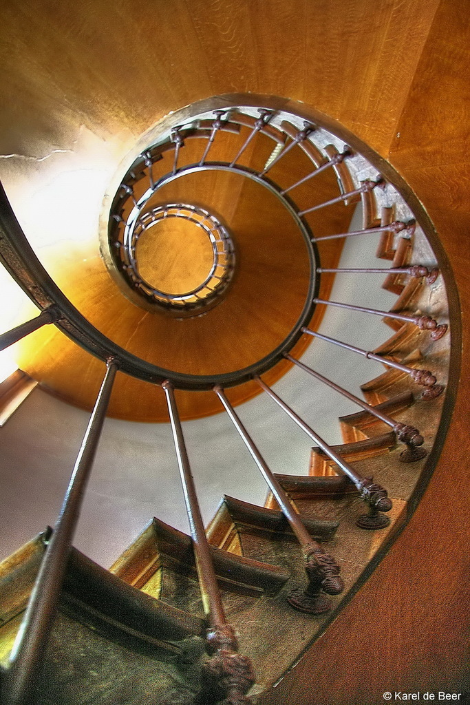 In het flamboyante Loire-kasteel van Azay-le-Rideau (Frankrijk, Indre-et-Loire) is dit de vroegere dientrap. Terwijl ik in het midden zittend de camera omhoog richtte zag ik hoe door de raampjes boven het licht mooi binnen viel. Deze foto is geëxposeerd in Agora Gallery (NYC, 2013). Foto uit 2011 met een Canon 400D. Beschikbaar als fotoprint op dibond, bedekt met plexiglass 3 mm. Beperkte oplage, tot 10 stuks.