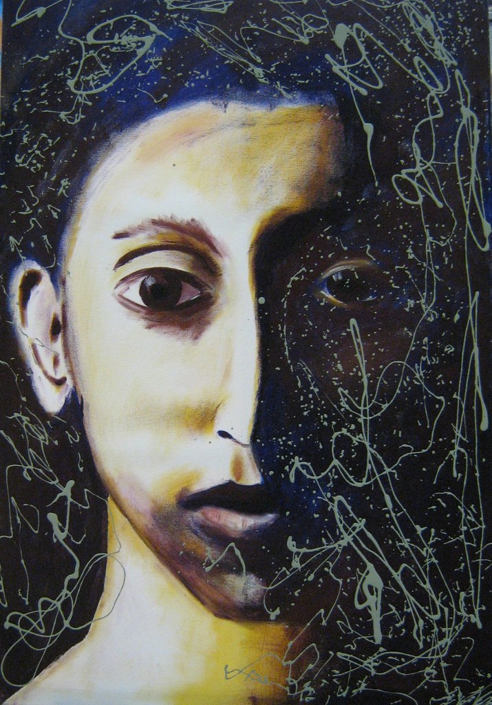 Een mix van een portret van wat een Italiaan zou kunnen zijn en drippings met lakverf.