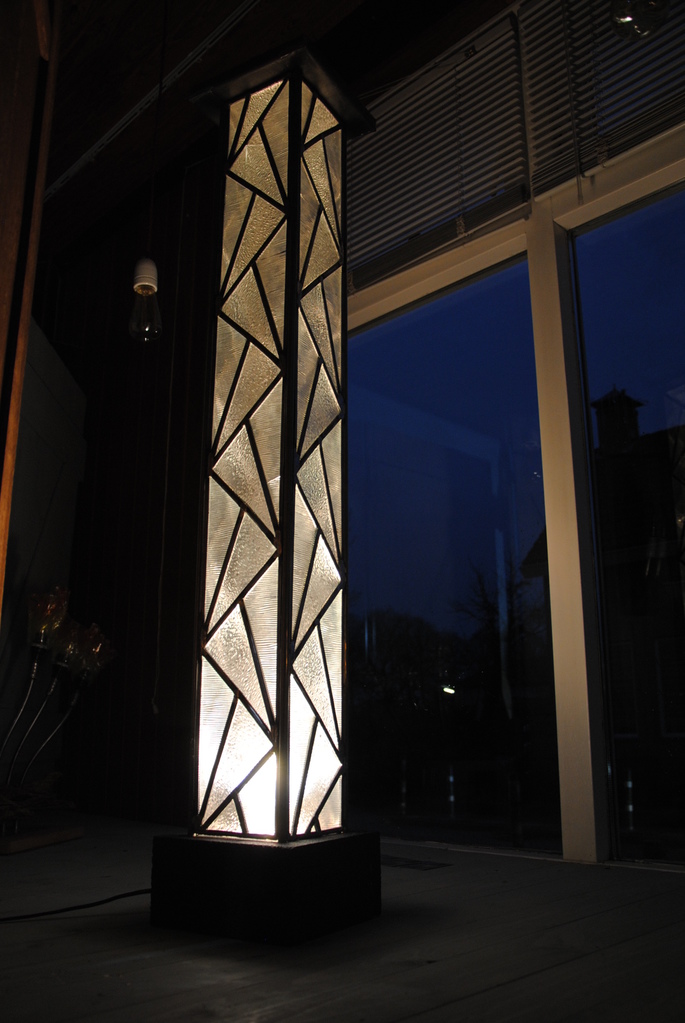 Frame van metaal, panelen glas-in-lood, voet van beton, deksel van lood.