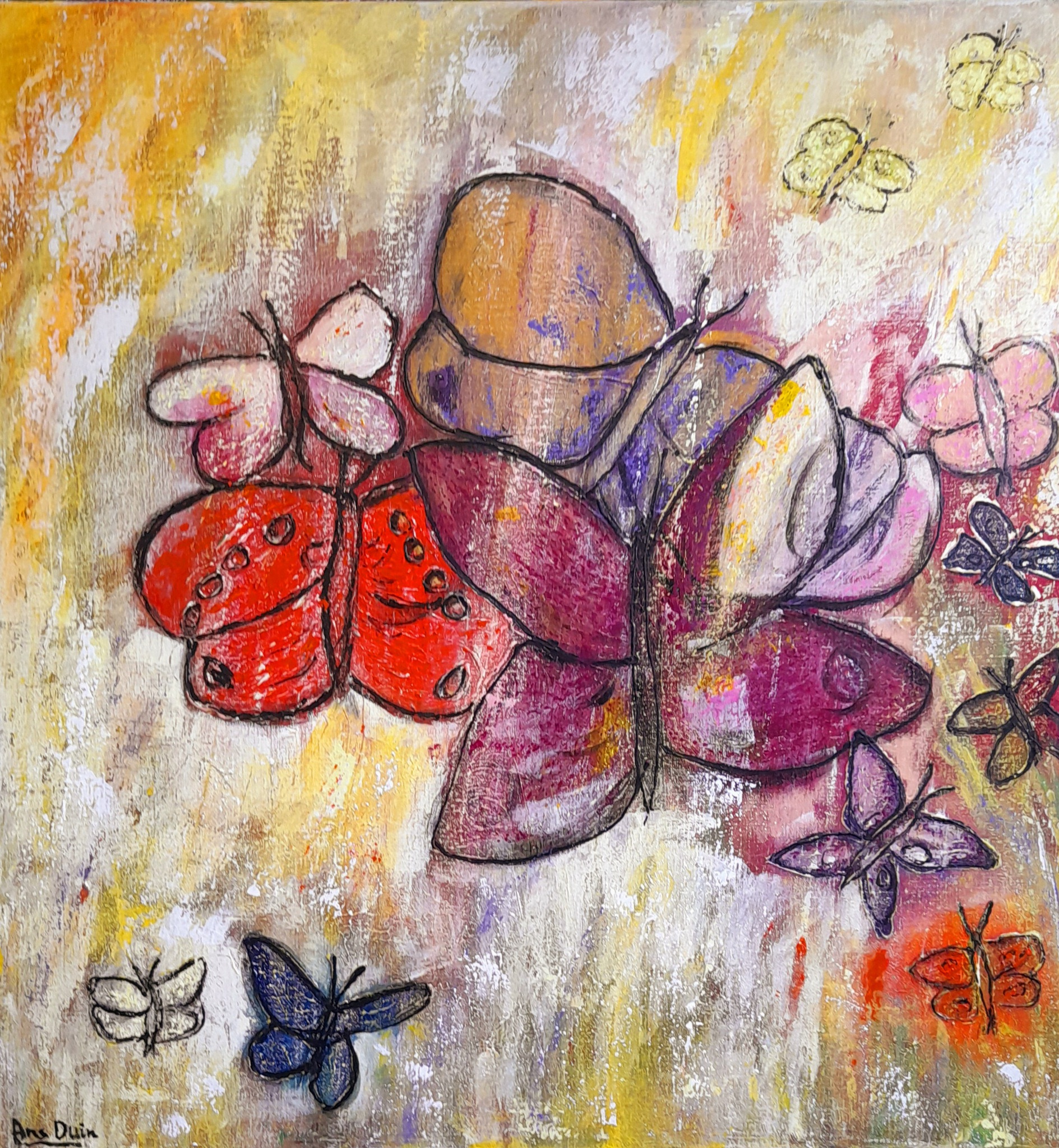 Butterflies dancing together in the light, they touch me, I am connected to them and I know ... it is good, I am alive! Title: Together we are one! Super nice object on your wall! Mixed media on linen (mounted in aluminum frame) .Size 80 x 80 cm x 4 cm ..
