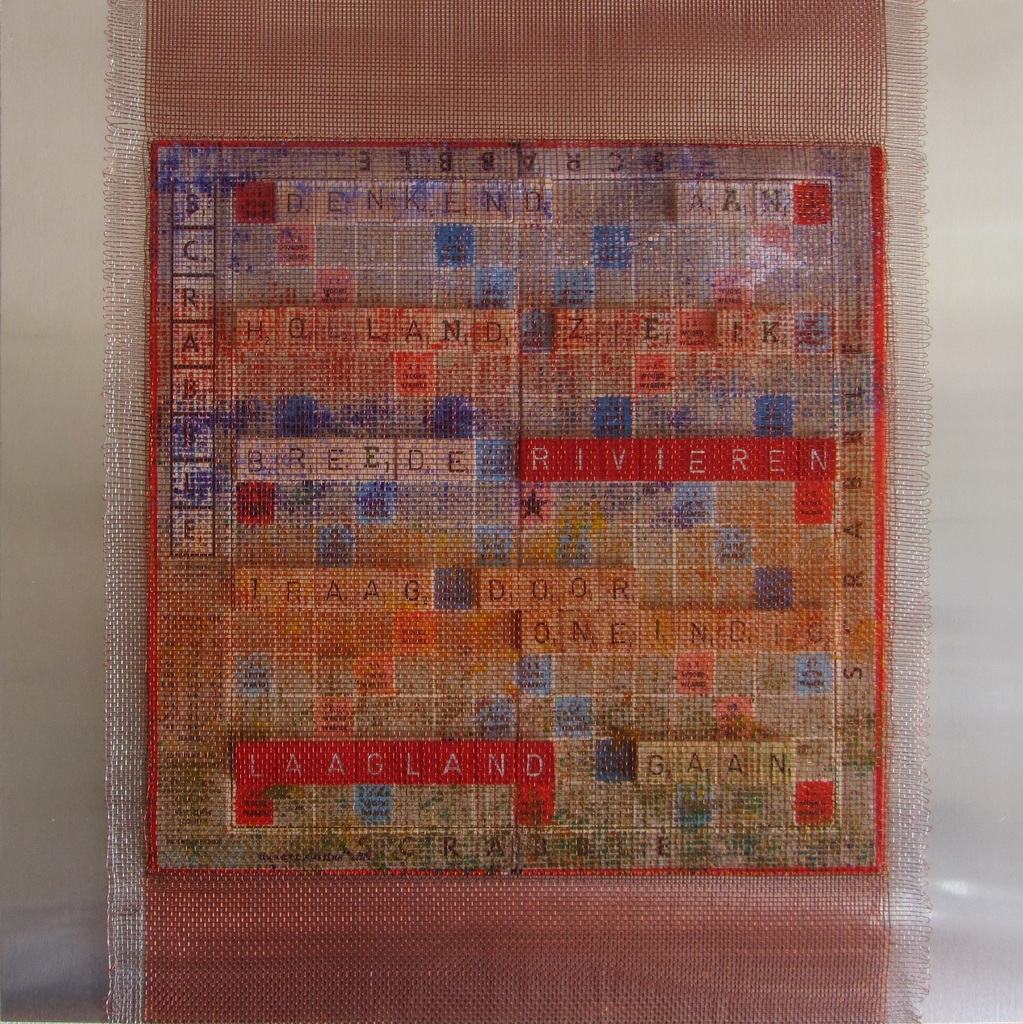 'denken aan holland zie ik breede rivieren door oneindig laagland gaan' gedicht van marsman verwerkt in scrabble met koperdraad, bevestigd op aluminium plaat