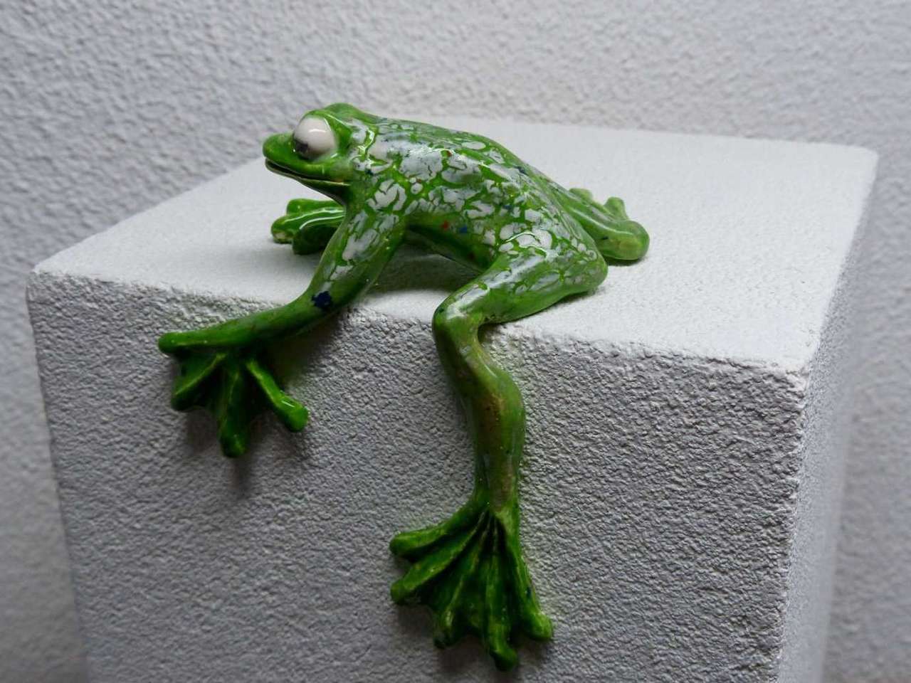 Kikkertje, zittend op de rand van . . . afgewerkt met krimpglazuur.