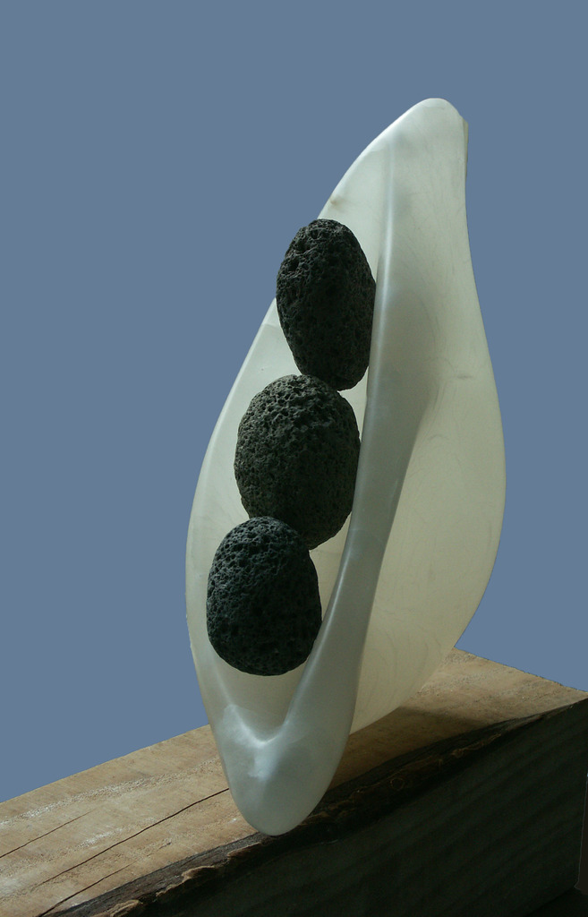 Geïnspireerd door mijn bezoek aan IJsland in juli 2012 -waar vandaan ik een aantal vulkanische stenen mee nam- heb ik dit beeld gemaakt tijdens mijn jaarlijkse bezoek aan Beauregard. Ik combineerde de stenen met wit albast. Het beeld symboliseert waar IJsland voor mij voor staat : vulkanen en gletsjers.