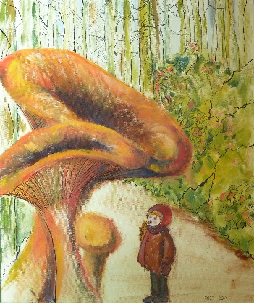 Een heel nieuwe weg, die ik ingeslagen ben en toch zo bekend. Een geschilderd en getekend schilderij. Paddestoelen en een kind.