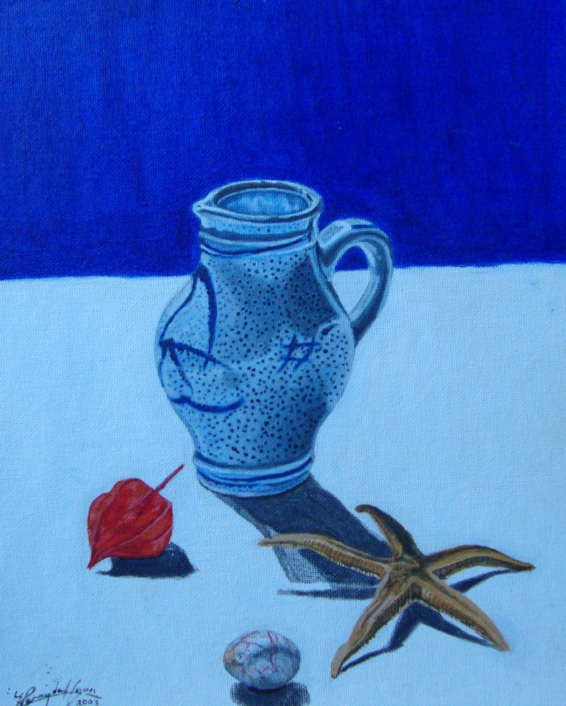 Een klein formaat modern stilleven in olieverf op canvasboard met onder andere,een kannetje en een zeester.