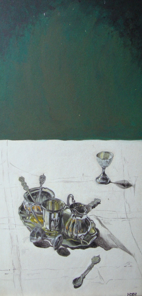 Stilleven met zilverwaren op een wit kleedje met expressieve goene achtergrond.