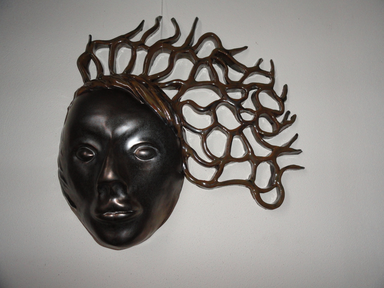 Wandobject gezicht met wapperende haren in de wind bura. Gebutseerd uit witte aardewerkklei.Het gezicht is geglazuurd met satijn zachte bronzen glazuur en de haren met aventurijn glazuur. Gestookt op 1060 graden.