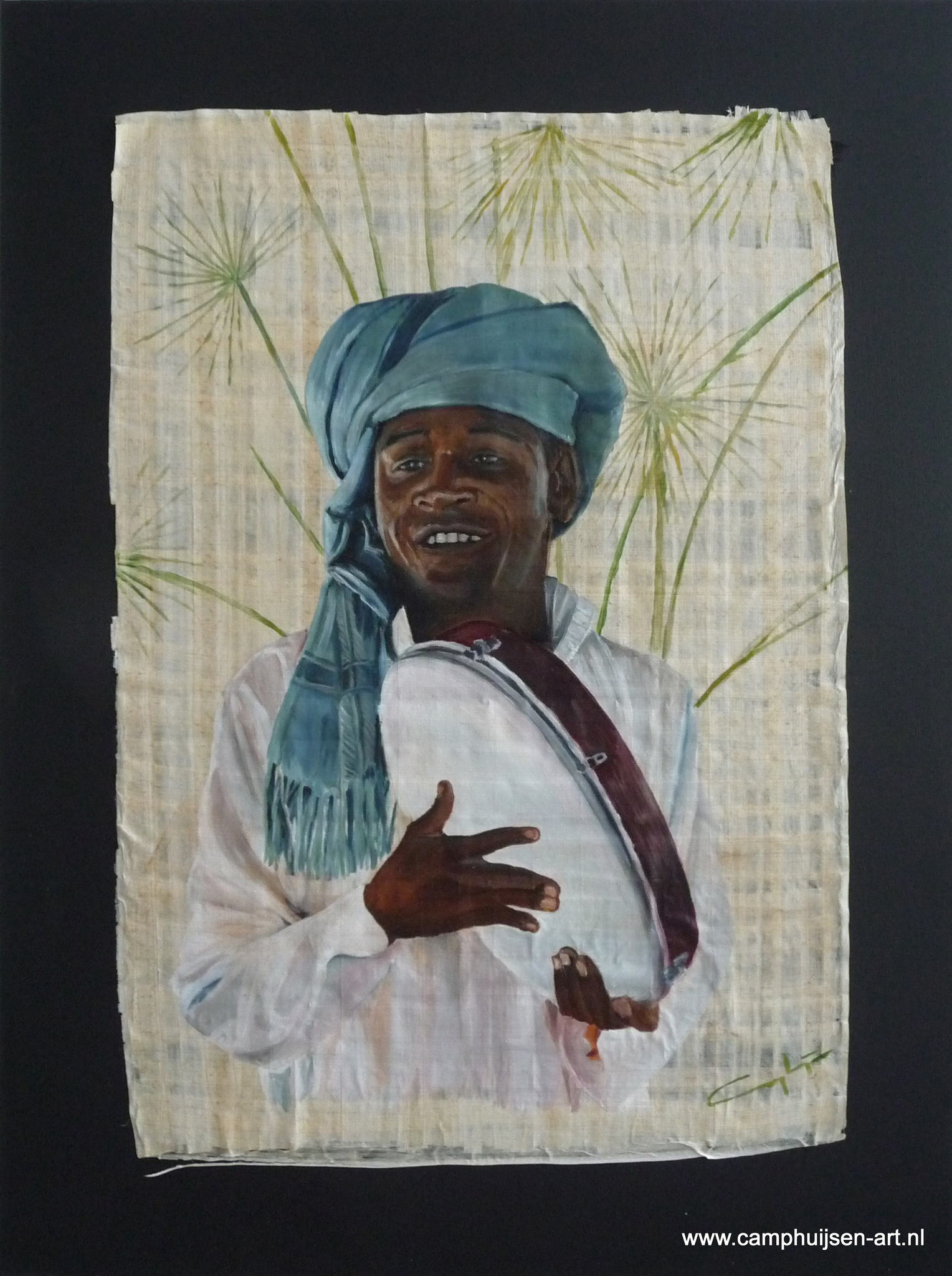 Een egyptische muzikant geschilderd op papyrus, na een bezoek aan egypte en ontmoetingen met de egyptische cultuur via muzikanten en historische projecten.