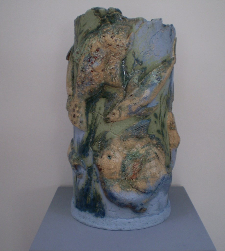 Vaas met vissen....bewerkt met engobes en glazuren.