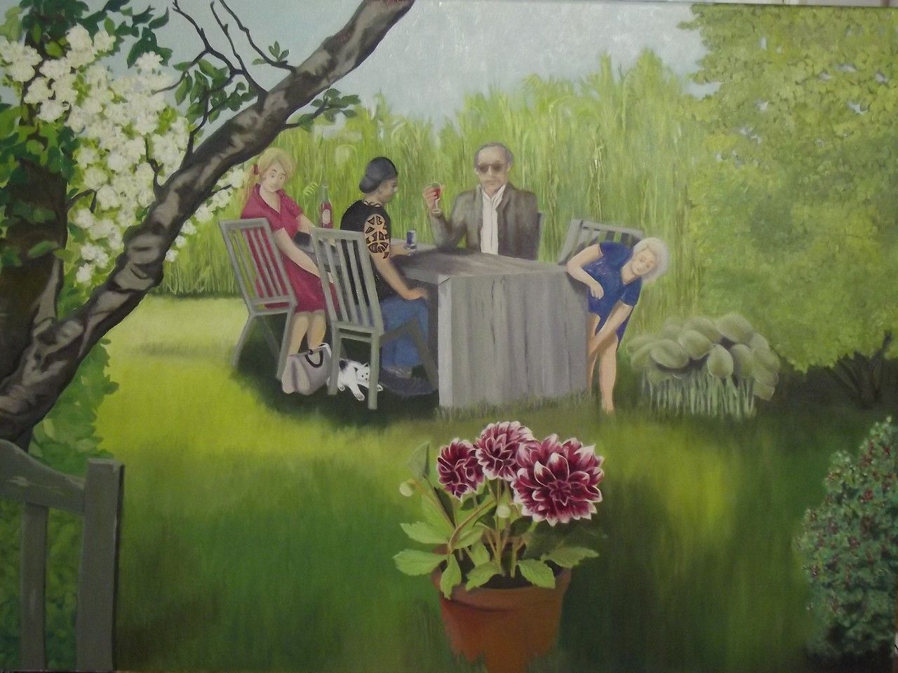 Impressie van een ongemakkelijk gesprek. Ondanks de romantische omgeving- een oude boomgaard- botsen de persoonlijkheden. De vrouwen sluiten zich af van het gesprek en kijken weg.