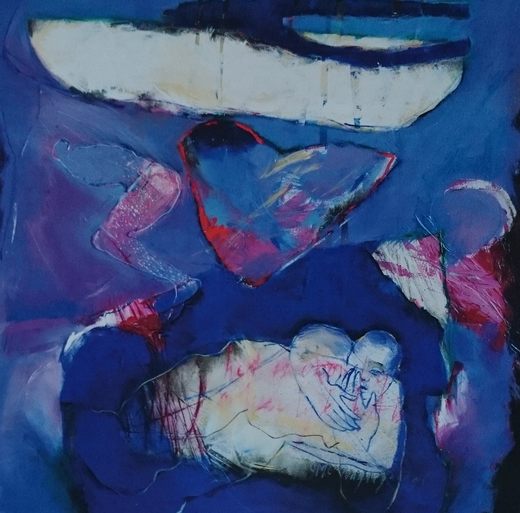 een schilderij met 3 figuren met ertussen hun (gebroken ) hart). schilderij gepubliceerd Villa d,Arto kunstkalender 1998