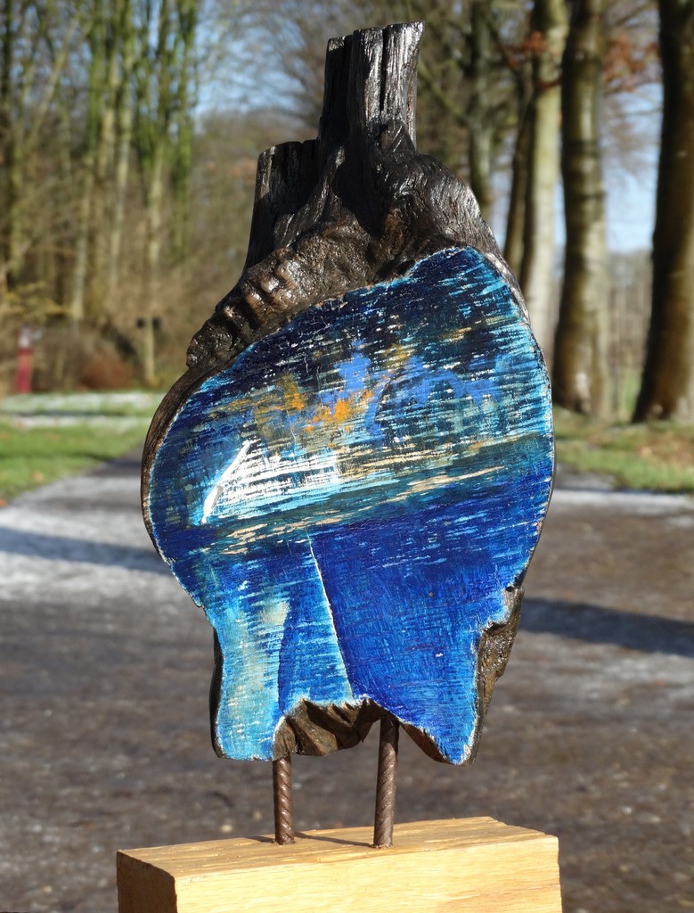 Dualiteit: er is geen groter verschil onder mensen / dan dat tussen man en vrouw / dat zou de enige casus belli moeten zijn. Samenwerking tussen m'n partner (gaf vorm aan stronk hout, www.meurtant.exto.org) en mij, Jeanine Keuchenius (verf) Assemblage: gezaagd, verweerd stronk hout, voetstuk, ijzer, gouache, maat 40x18x15 cm