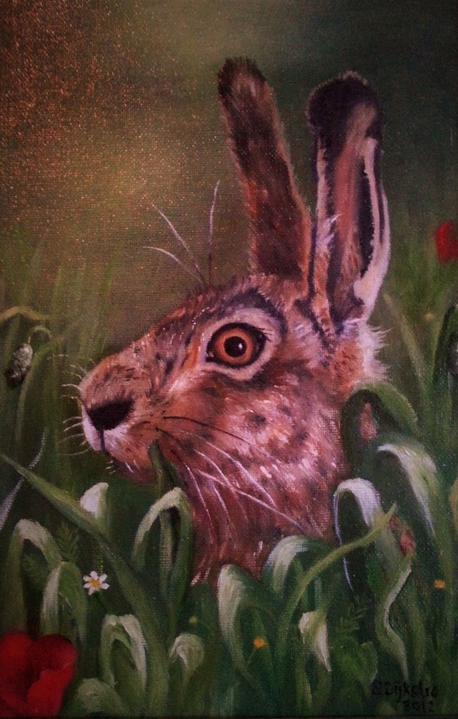 Haas Gras Bloemen Olieverf Groen Rood Bruin Dier Grasveld Klaproos