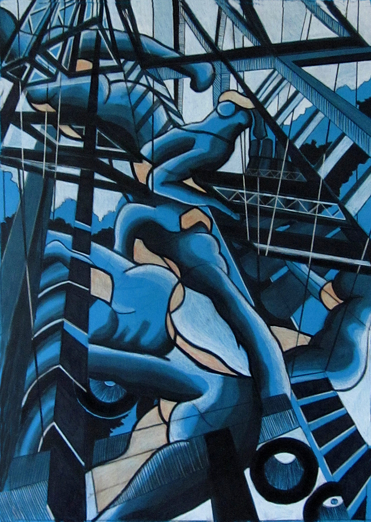 Drawing is a discipline in which ‘looking outside’ and ‘looking and moving within the frame of the paper’ is very important. Sources of inspiration are urban and industrial landscapes and shapes of the human body. Tom’s work consists of countless shades of black but he also uses colour in an exciting way. The artworks change as the daylight changes. Observations and impressions from spending time outdoors inspire his artwork. His skilled drawings may develop into new drawings as well as paintings. In his paintings he combines colour, patches and blots with lines to create several spaces.