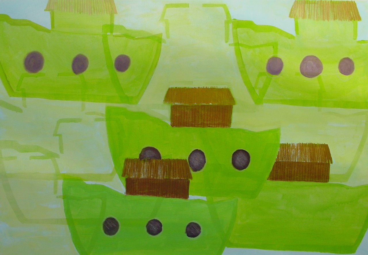 Vrije weergave van bootjes voor op een kinderkamer, n.a.v. het schideren van de ark van Noach.