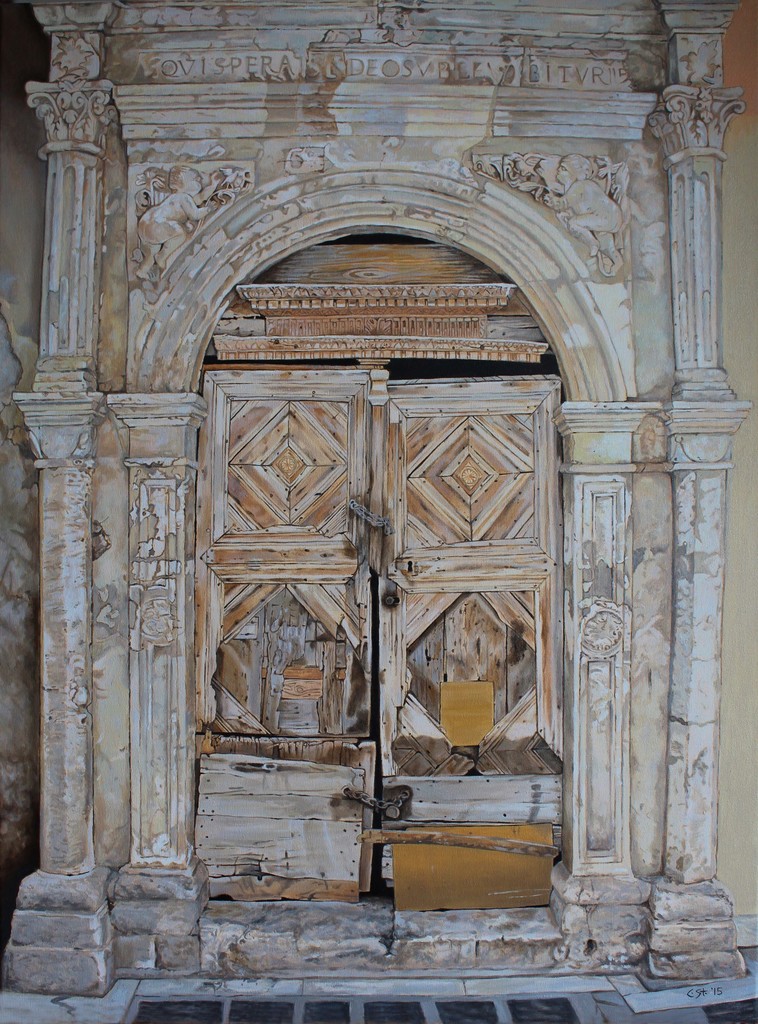 Korintisch-gotische Zuilengallerij Oker Hout Bruin Realistisch Olieverf Old Brown Oude Venetiaanse Deur Particuliere Woning Rethymnon Kreta Griekenland Sienna Poort Greece Gate Realistic Zandsteen Wood Ocre