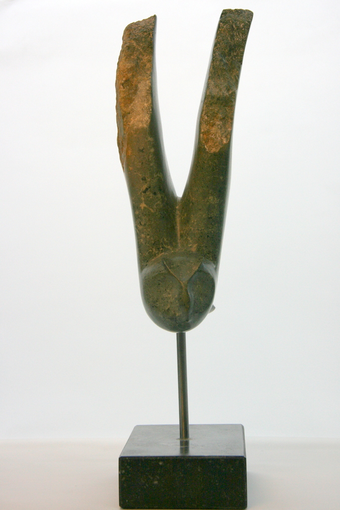 Vliegende uil, met de vleugels uitgestrekt omhoog. Contrast tussen gladde gepolijste delen en de ruwe buitenkant van de steen die nog in de vleugels is te zien.