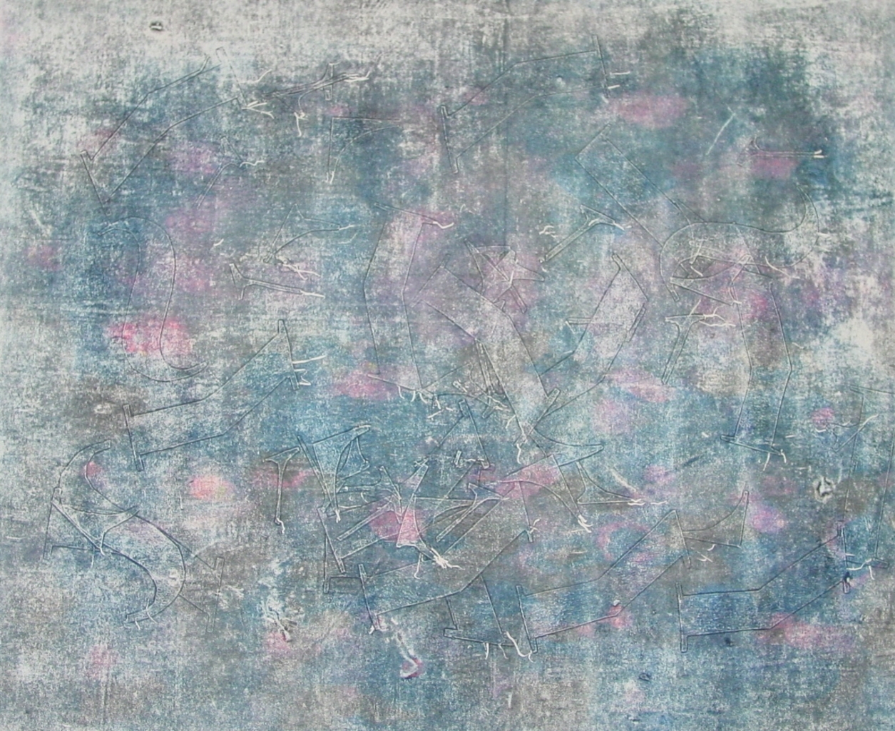Tweede afdruk van druktechniek met een sjabloon en olieverf