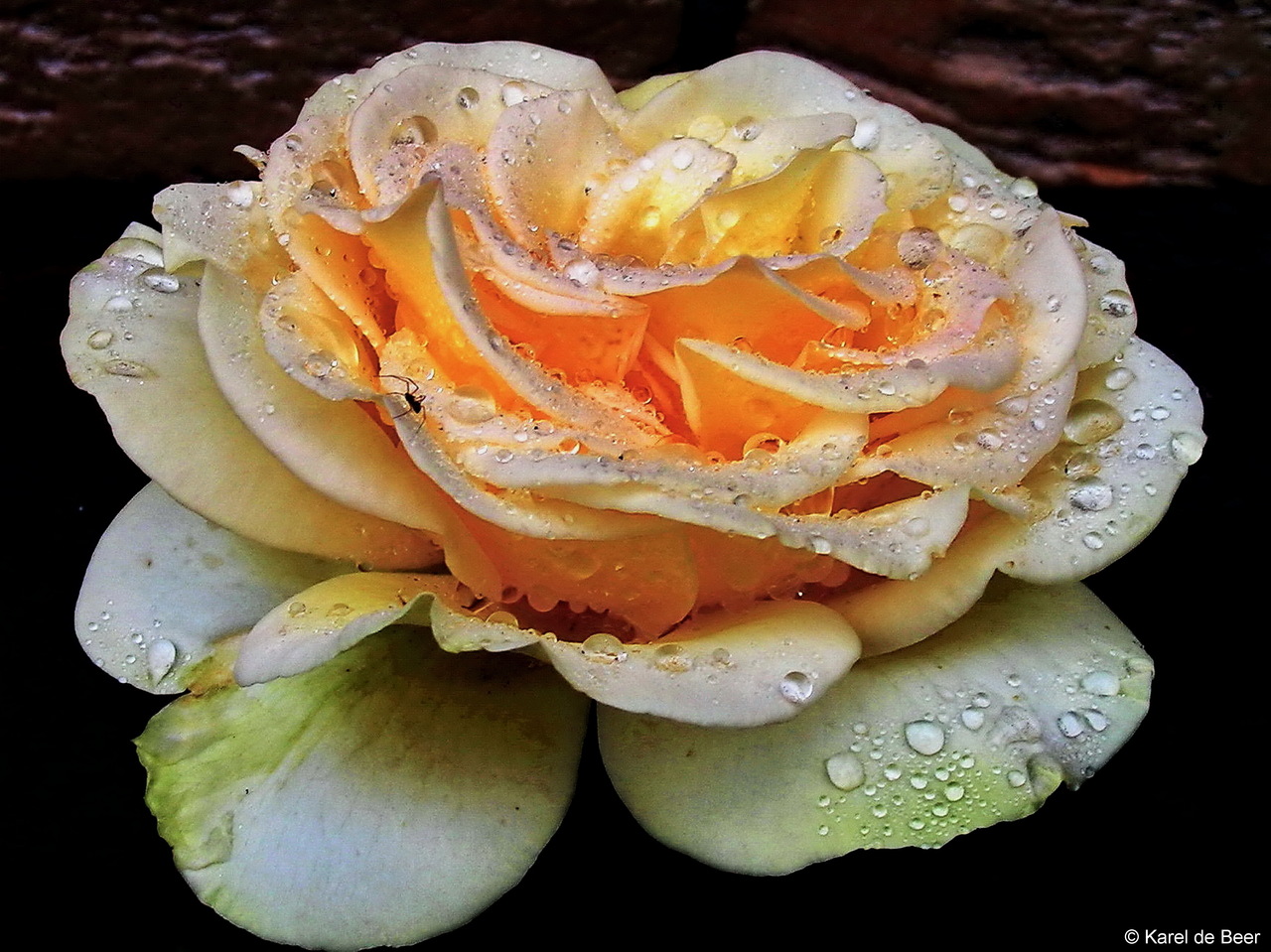 Roos in onze eigen achtertuin na een zomerse regenbui, dient als drinkplaats voor een dorstig achtvoetertje. Compositie uit 2006 gemaakt in Tilburg met een compacte Minolta Z1 die was voorzien van een zeer goede zoomlens. Beschikbaar als fotoprint op dibond en bedekt met plexiglas 3 mm. Beperkte oplage, tot 10 stuks.