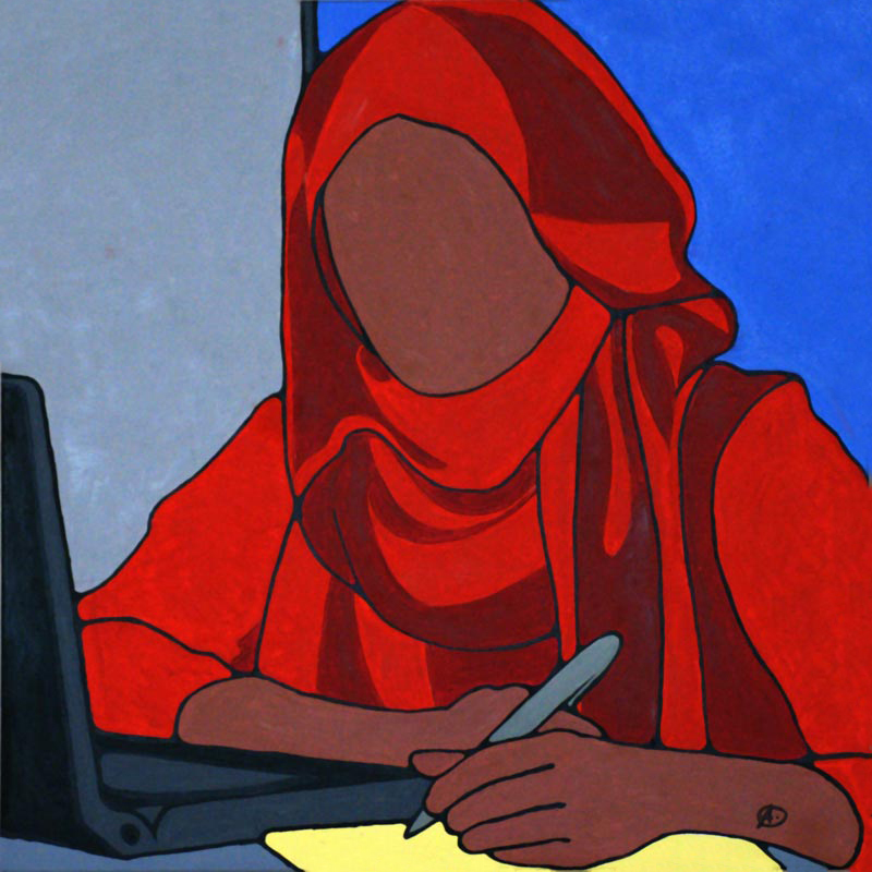 Dit is Safia. Ze is afkomstig uit Somalië en haar naam betekent ‘zuivere en oprechte vriendin’. Haar vader werkte voor de Somalische ambassade en zo is ze op jonge leeftijd hier terechtgekomen. Ik heb haar ontmoet op de universiteit waar ze politieke wetenschappen studeerde. We hebben uren met elkaar gepraat. Samen met haar ouders bezocht ze nog regelmatig haar geboorteland. Het was haar grote droom zich daar ooit definitief te vestigen om haar landgenoten te kunnen helpen. Maar dat was buiten de liefde gerekend. Ze werd verliefd op een jongen van hier en haar ouders hebben daar vrede mee. Ze zet zich nu in voor de integratie van moslimvrouwen in onze maatschappij.