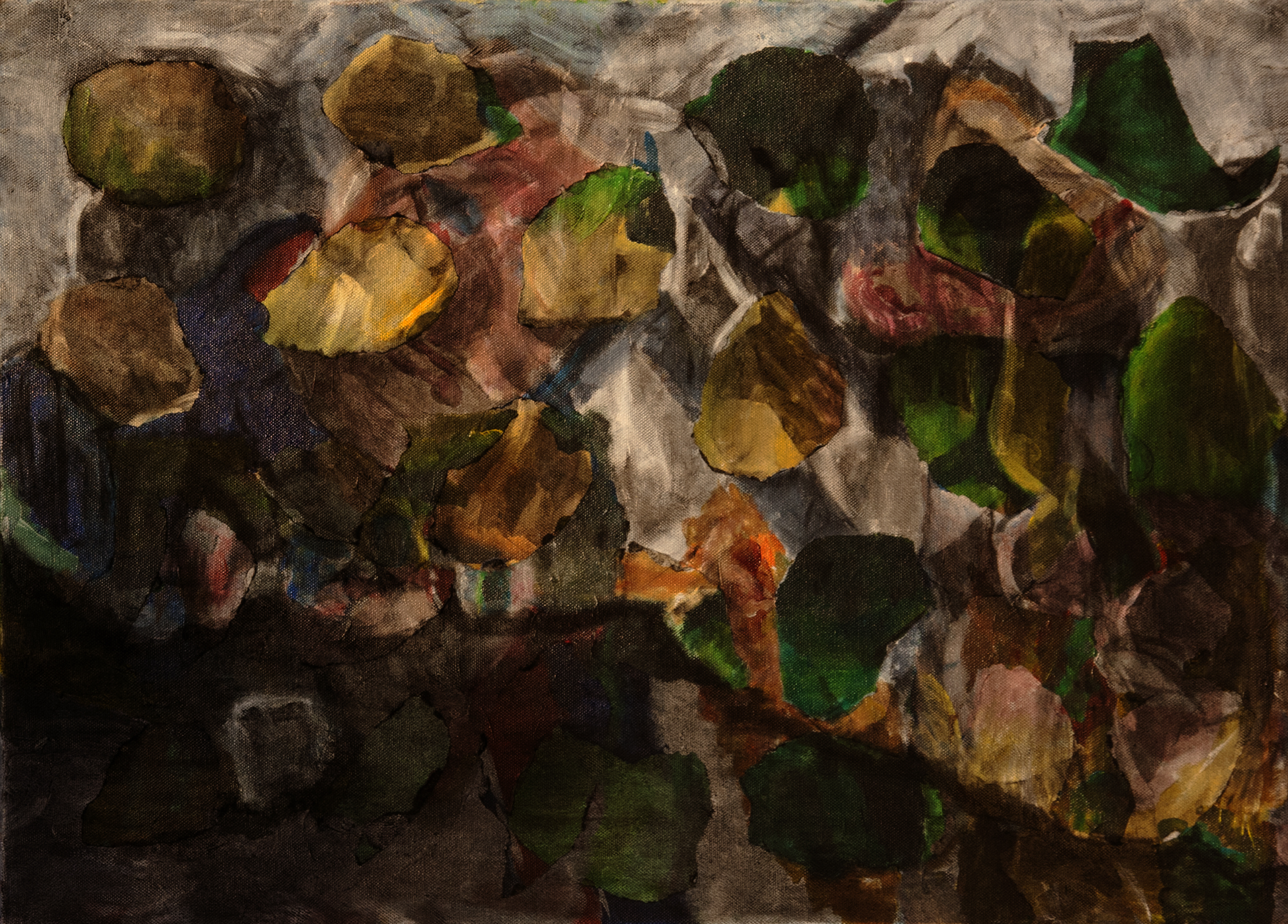 Acryl, papier en houtskool op doek