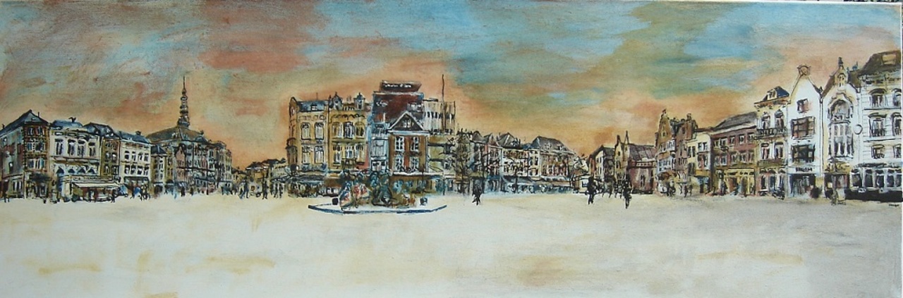 Skyline markt 's-Hertogenbosch. Getekend en geschilderd met rietpen en penseel in diverse kleuren (zwart, umber, blauw, gebrande siënna) inkt op doek 40x120 cm.
