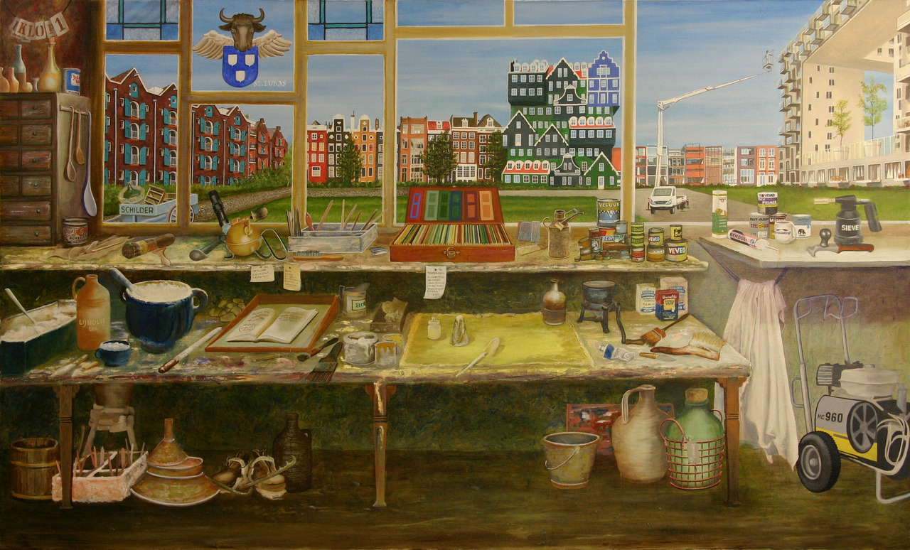 Een schilderswerkplaats vanaf ca.1900 tot 2012 met uitzicht op Amsterdam in die periode